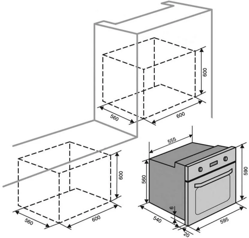 Большинство встраиваемых духовок имеют габариты, подходящие для стандартной ниши в кухонной мебели, которая имеет форму параллелепипеда с высотой 60 см и чуть меньшей шириной и глубиной. Дверца жарочного шкафа должна полностью закрывать собой эту нишу, а он сам свободно размещаться в ней, не соприкасаясь со стенками мебели. Поэтому ещё до покупки нужно выяснить габариты выбранной модели и сопоставить их с размерами места под духовку.