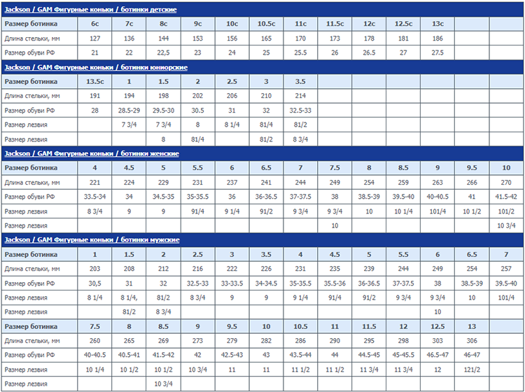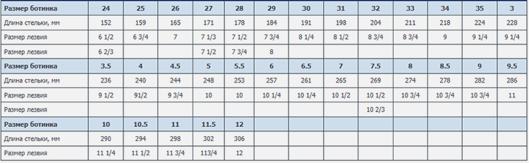 ВНИМАНИЕ: Несмотря на то, что все данные таблиц взяты из официальных каталогов производителей, их все же стоит воспринимать только как рекомендации, не дающие гарантий идеальной посадки хоккейных коньков. В силу особенностей конструкции размеры как любительских, так и профессиональных коньков NIKE, ССМ, GRAF, BAUER, EASTON и RBK могут незначительным образом отличаться, поэтому всегда ПРИ ПОДБОРЕ РАЗМЕРА ТРЕБУЙТЕ КВАЛИФИЦИРОВАННОЙ ПОМОЩИ, А ТАКЖЕ ТЩАТЕЛЬНО ПРИМЕРЯЙТЕ КОНЬКИ ПЕРЕД ПОКУПКОЙ!. СПАСИБО! hockey-mag.ru