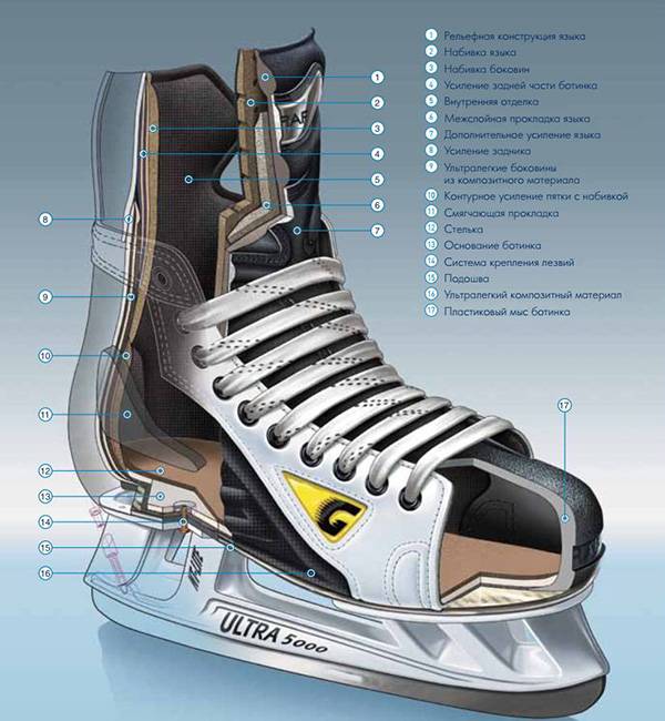 Коньки хоккейные состоят из 3 основных частей: стакана, лезвия, ботинка. От их характеристик зависит удобство и надежность экипировки.