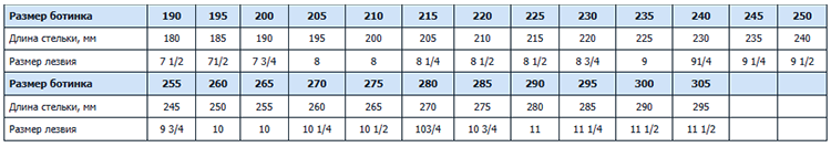Чтобы определить размер лезвия необходимо найти нашивку на язычке ботинка, на которой указаны размер и полнота ботинка. После этого в соответствии с этими показателями нужно подобрать длину лезвия. Для размера 1 и 1.5 длина лезвия составляет 212 мм.