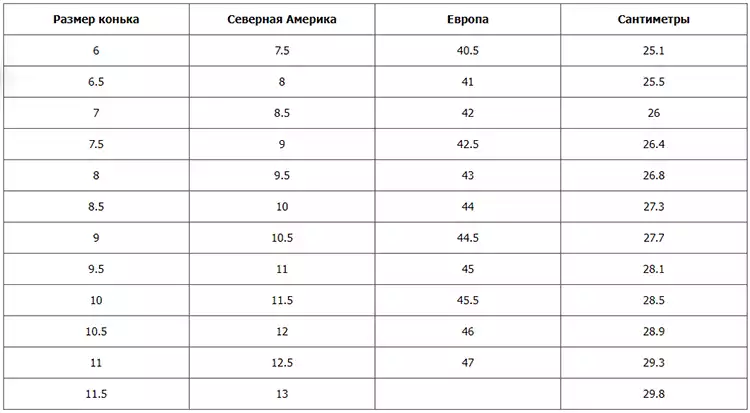 К ним относится длина и полнота стопы, особенности подъема. Размеры могут существенно отличаться. Например, 40-й российский и 7,5-американский или английский. Это связано с тем, что европейцы и россияне измеряют в сантиметрах, англичане и американцы в дюймах. Чтобы избавиться от путаницы – пользуйтесь размерными сетками производителей коньков. Их несколько вариантов: