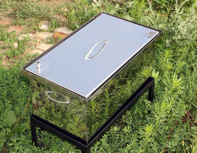 Эта коптильня из нержавейки чуть меньше, чем описанная выше. Объем ее камеры составляет 30 л. Но зато это идеальный вариант холодной коптильни для дома.