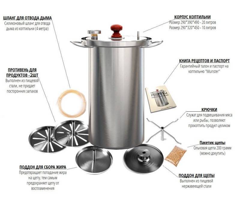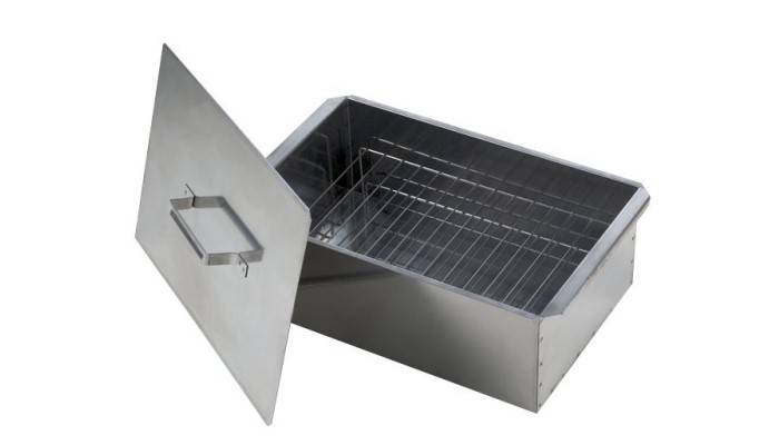 Через крышку продукты помещаются внутрь или достаются по степени готовности. Поддон требуется для опилок. Они, нагреваясь, выделяют ароматический дым и коптят пищу.
