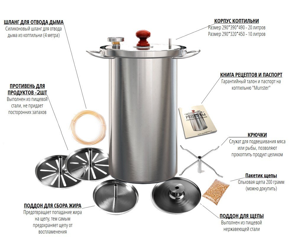 В комплектацию этой коптильни входят сама емкость для копчения и дымогенератор. Для подачи дыма используются гофрированные шланги, а для отведения дыма из помещения — силиконовый шланг. Запустить такую коптильню не сложно: достаточно подготовить продукты, разместить их в емкости для копчения, наполнить дымогенератор щепой, подсоединить все шланги и поджечь щепу. Дальше останется только дождаться готовности продукта.