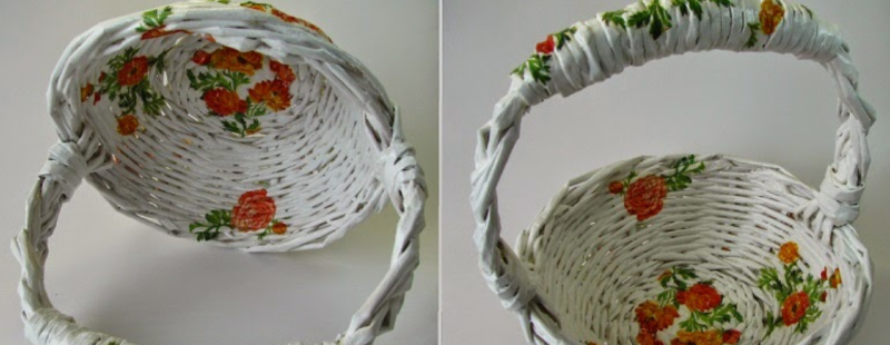 Корзинка из газеты готова. Смотрится она оригинально и необычно. На первый взгляд кажется, что изделие покупное. Это говорит лишь о том, что творческий процесс прошел успешно.