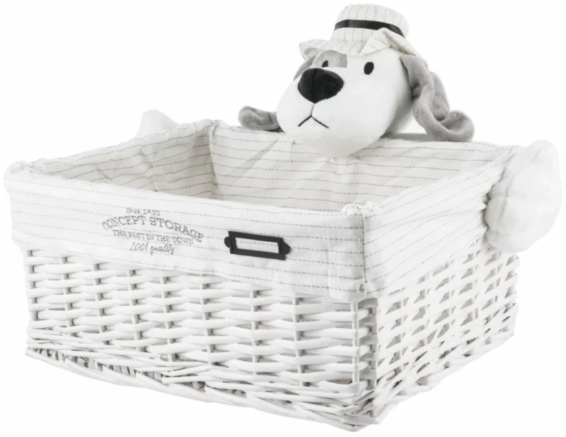Привлекательная плетеная модель впишется в любой интерьер. Корзина дополнена декоративным элементом в виде мордочки собачки. Вместительная и удобная она станет незаменимым помощником хозяйки в наведении порядка в комнате малыша, да и сам малыш будет с удовольствием собирать в нее игрушки Корзина выполнена из ивовой лозы, что гарантирует безопасность здоровью ребенка. Ее средняя цена — 4000 рублей, а многочисленные отзывы покупателей доказывают, что товар стоит этих денег.
