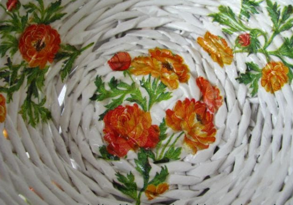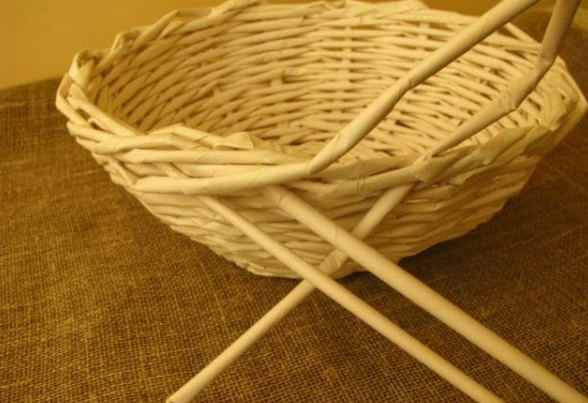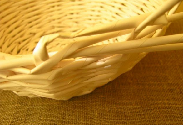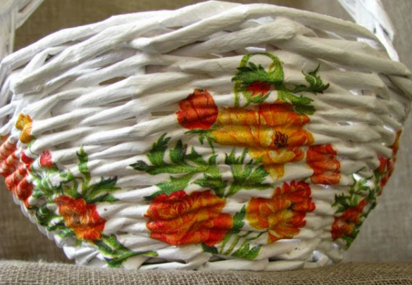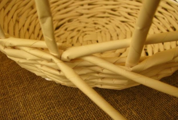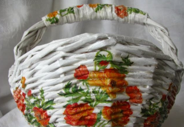 Корзинка из газеты готова. Смотрится она оригинально и необычно. На первый взгляд кажется, что изделие покупное. Это говорит лишь о том, что творческий процесс прошел успешно.