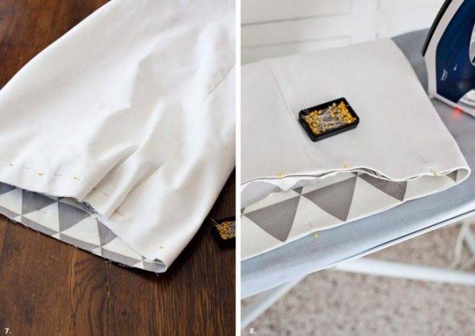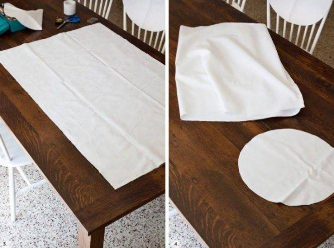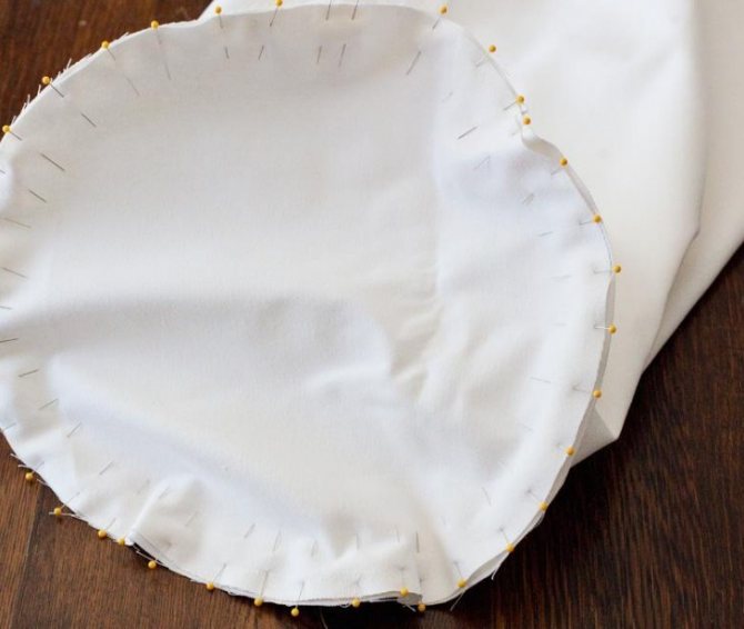 Теперь складываем ткань пополам лицом внутрь и подворачиваем кромки, скалывая их булавками. Примеряем, совпадают ли дно с длиной ткани. При необходимости ширину можно изменить. А теперь сшиваем наше полотно, после чего фиксируем дно булавочками. Кромка прошивается (или прострачивается на машинке) вдоль длины круга.