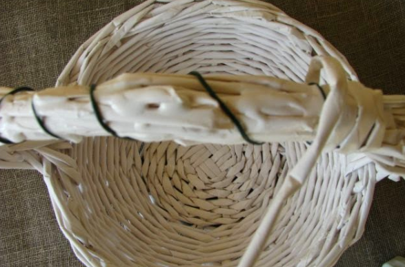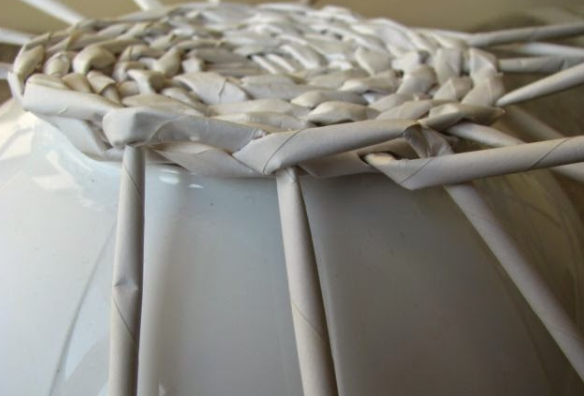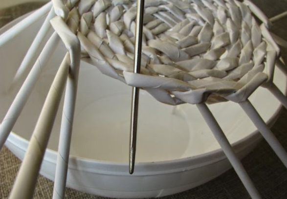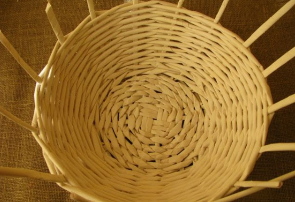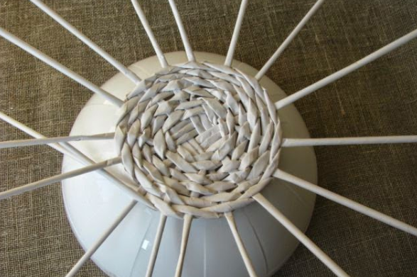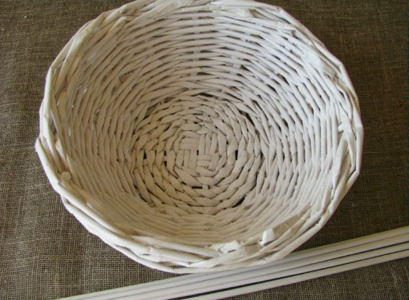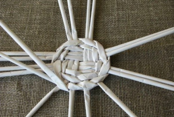 С их помощью плетем еще 1 круг, но лозу заводим под трубочки верхнего ряда.