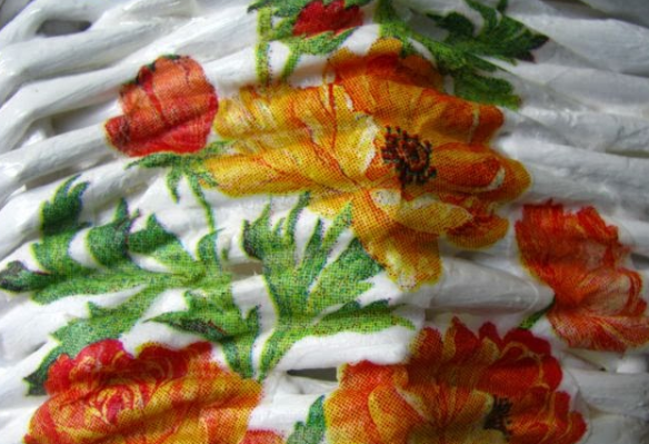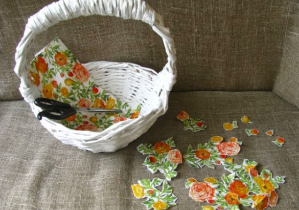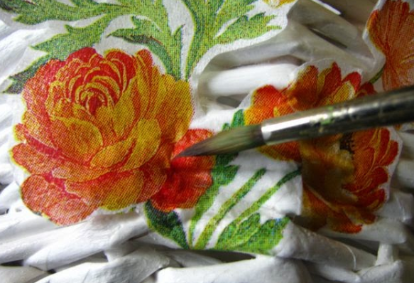 Аккуратно отделяем от салфетки слой с изображением, прикрепляем картинки к корзинке.