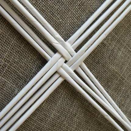 Плетем дно изделия. Для этого берем 8 трубочек, формируем из них квадрат. Рабочую деталь перегибаем, заводим за 2 стойки. Верхнюю трубочку опускаем вниз, а нижнюю переводим наверх.