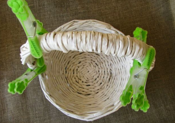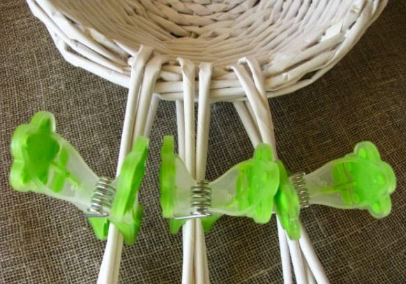 В результате получаем 12 стоек, которые делим на 3 пучка. Каждую часть плетем в косу, сверху заготовку фиксируем прищепками. Делаем ручки с 2 сторон.