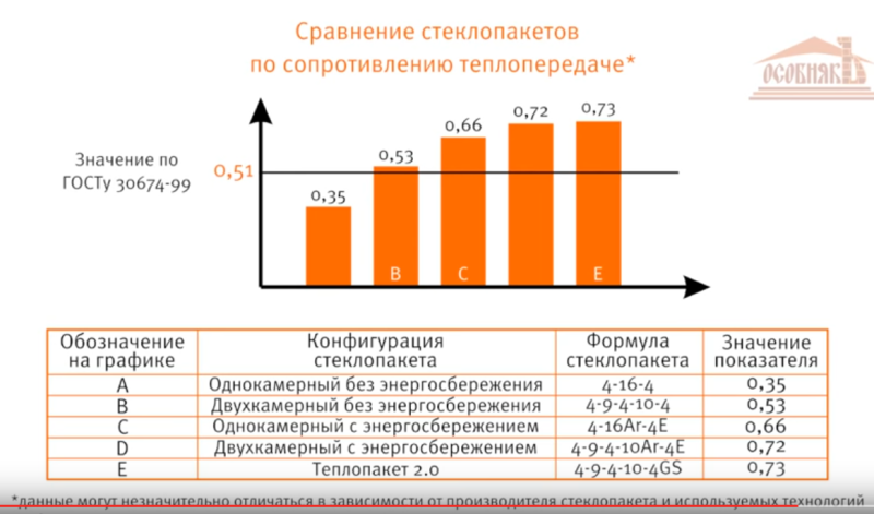 Для климатической зоны Санкт-Петербурга приведенное сопротивление теплопередаче должно быть не менее 0,51. Для наглядности покажем данные ГОСТ по наиболее популярным стеклопакетам: