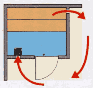 Приточное и вытяжное отверстия и дверь сауны должны выходить в одно и тоже помещение ванной. Циркуляция воздуха из сауны в ванную и обратно снижает потери тепла, способствует подогреву воздуха и в ванной комнате.