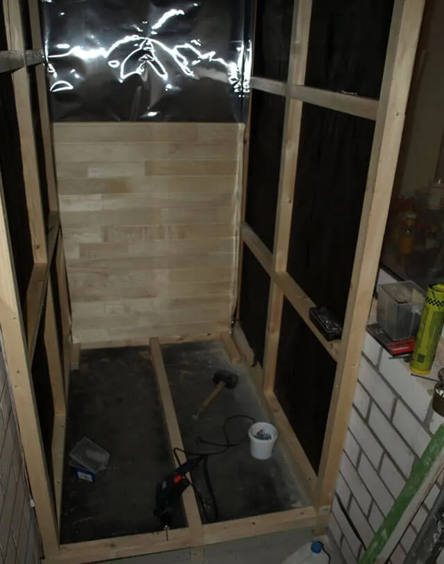 Помещение для сауны замеряется. Затем из обычного бруса делается каркас. Достаточно будет высоты 2 м. Каркас обшивается вагонкой и укладывается фольгированный утеплитель отражающей стороной наружу. Каркасные бруски сначала следует плотно прижать к стене и выполнить обвязку на 5 уровнях.