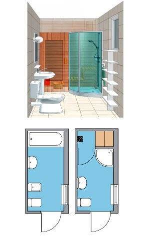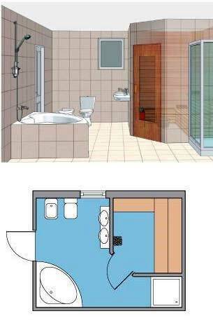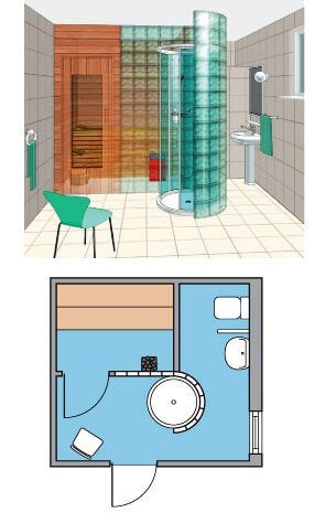 В существующей ванной комнате вместо ванны можно установить две кабинки — душ и сауну