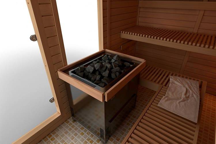 Внутри кабинки находится электрическая печь каменка для сауны, а также деревянные скамейки и полки в два или три уровня. Стенки и потолок кабинки — это трехслойный сандвич, который состоит из внутренних деревянных панелей, теплоизоляции из минеральной ваты и наружной облицовки.