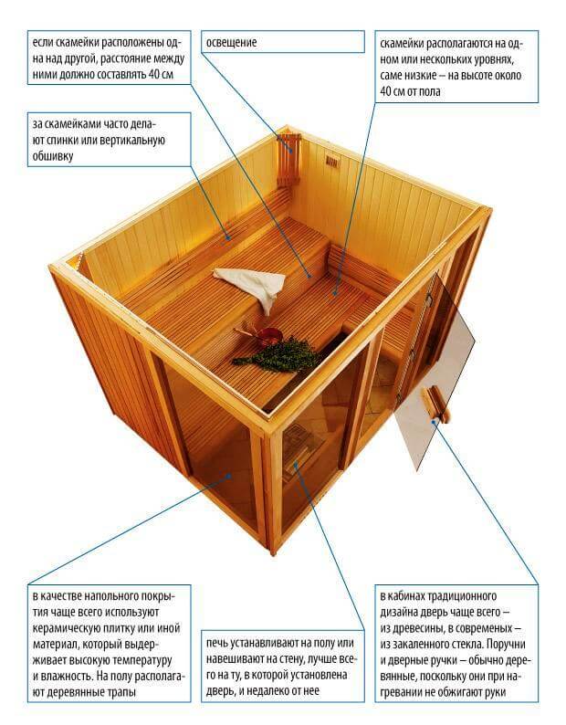 Каждый из них имеет плюсы и минусы, защищает поверхность от перегрева, выдерживает высокие температурные показатели. Из них создают не только саму конструкцию, но и дополнительные элементы к ней, такие как ручка на входной двери, сидения, полочки, пол.