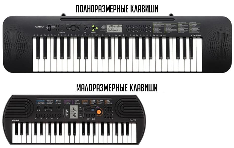 Модели с клавишами меньшего размера стоят дешевле, поэтому они вполне подходят для ребенка. В этом случае синтезатор больше выполняет роль игрушки. Объясняется это тем, что обучение полноценной игре на пианино связано с выработкой определенных моторных навыков. Т.е. человек должен привыкнуть к клавишам этого инструмента, и поэтому малоразмерные варианты для этих целей не подходят.