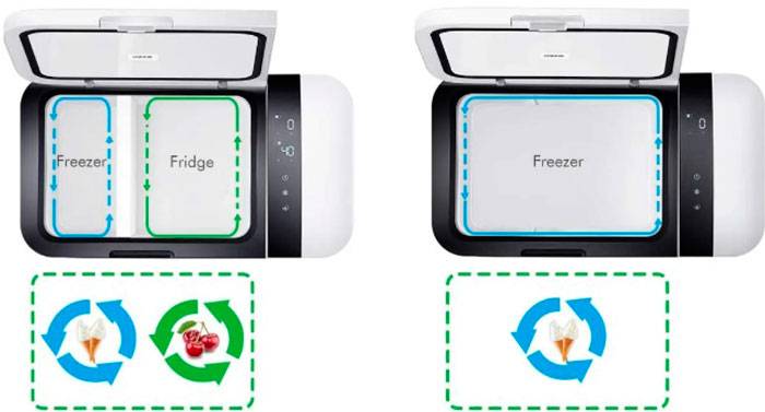 Если позволяют средства, лучше выбирать двухкамерные автохолодильники с раздельным поддержанием температуры. У этих устройств в одной из камер происходит заморозка до -20С (мясо, рыба, мороженное и другие продукты), а в другой устанавливается температура чуть выше ноля (для напитков).