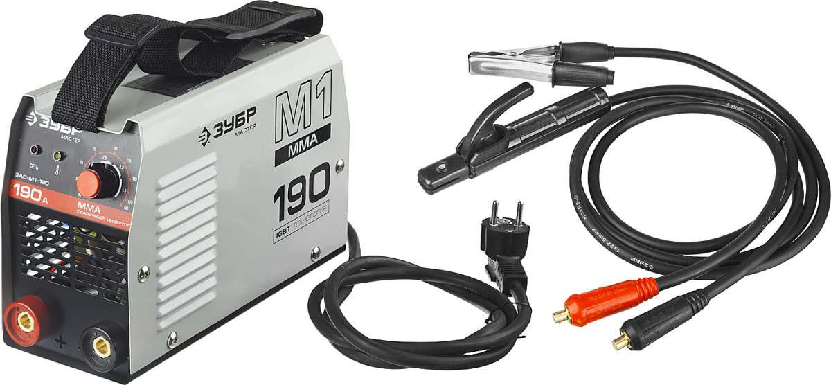 ЗУБР ЗАС-М1-190 (MMA) обладает микропроцессорным управлением, которое хорошо облегчает вес устройства, оно имеет массу 3,5 кг. Модель подходит для высотных работ. Мощность – 6,6 кВт, токовый максимум – 190 А. Несмотря на небольшие размеры, у сварочного аппарат много необходимых опций: защита от прилипания, перегревания, избыточной нагрузки, форсирование дуги, Hotstart. В комплектации идут провода с электрододержателем, зажимом на массу, ремешок для транспортировки.