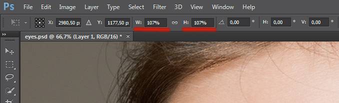 Лучше не растягивать глаз мышкой, а ввести на панели вверху процент, на который мы хотим увеличить выделенную область: