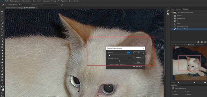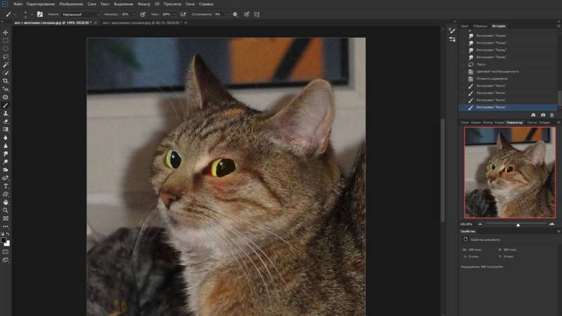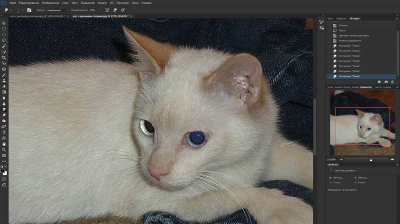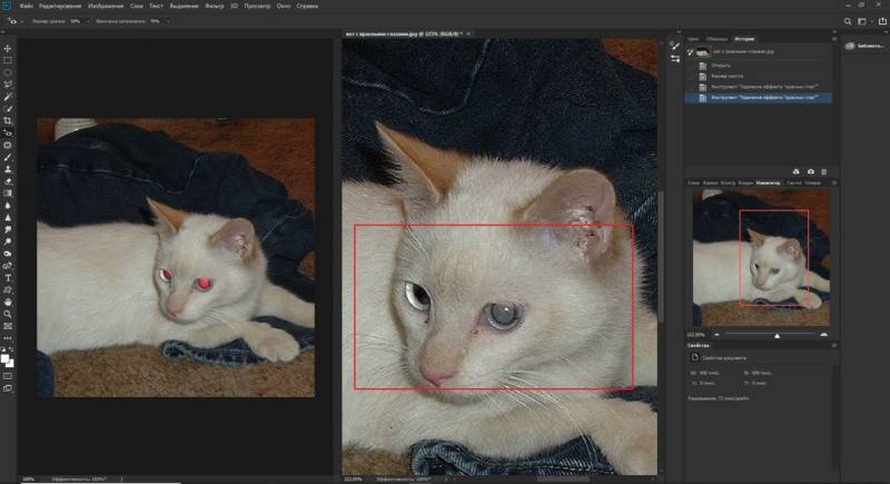 Ситуация усугубляется тем, что блики на фотографии распространились далеко за пределы зрачков и вообще глаз, окрасив даже шерсть вокруг. Здесь придётся проявить смекалку и использовать больше инструментов.