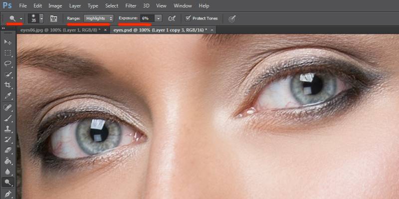 Имейте в виду, что за исключением случаев обработки очень светлых глаз, крайне важно соблюдать именно такую последовательность: сначала Dodge, затем Burn! В противном случае, если вы начнёте с затемнения, все тончайшие светлые прожилки в радужке просто исчезнут и уже не вернутся при осветлении
