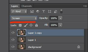 В данном случае мы продублируем слой клавишами Ctrl+J и выберем для него режим наложения Screen (в случае с изначально светлыми глазами можете поэкспериментировать с режимами Soft Light и Hard Light).