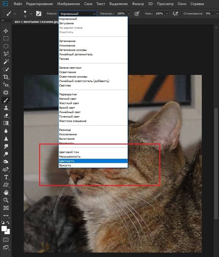Далее в настройках инструмента Кисть выберите такой ее размер, который полностью закрывает зрачок (путём примерки). Установите жесткость близкую к 100% и непрозрачность 100%. Выберите режим наложения Цветность из выпадающего меню.