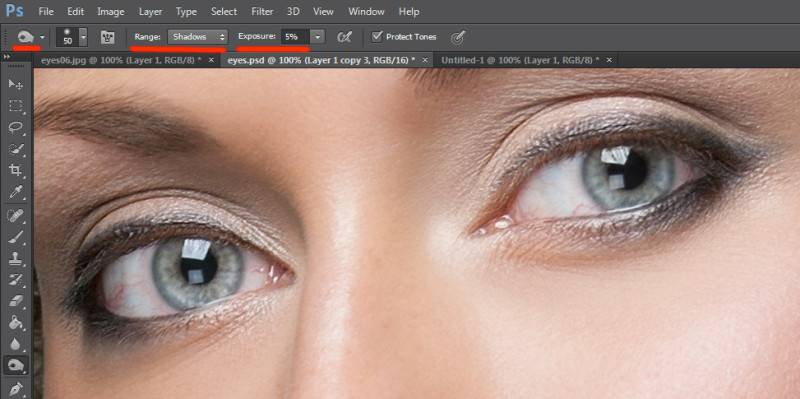 Осветлив светлое, перейдём к затемнению тёмного. Выбираем инструмент Burn Tool и устанавливаем Range: Shadows. Значение Exposure оставим в районе 5%.
