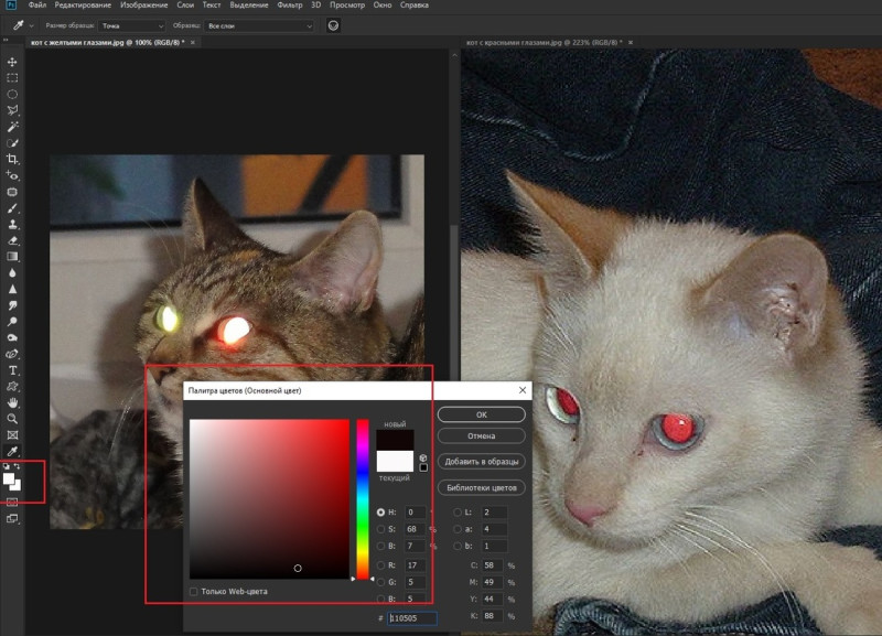 Данный способ можно использовать, если на фото глаза человека или животного освещены равномерно, и они действительно красные.