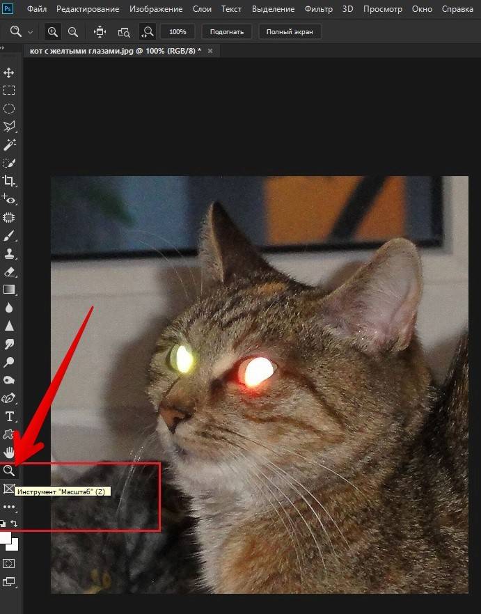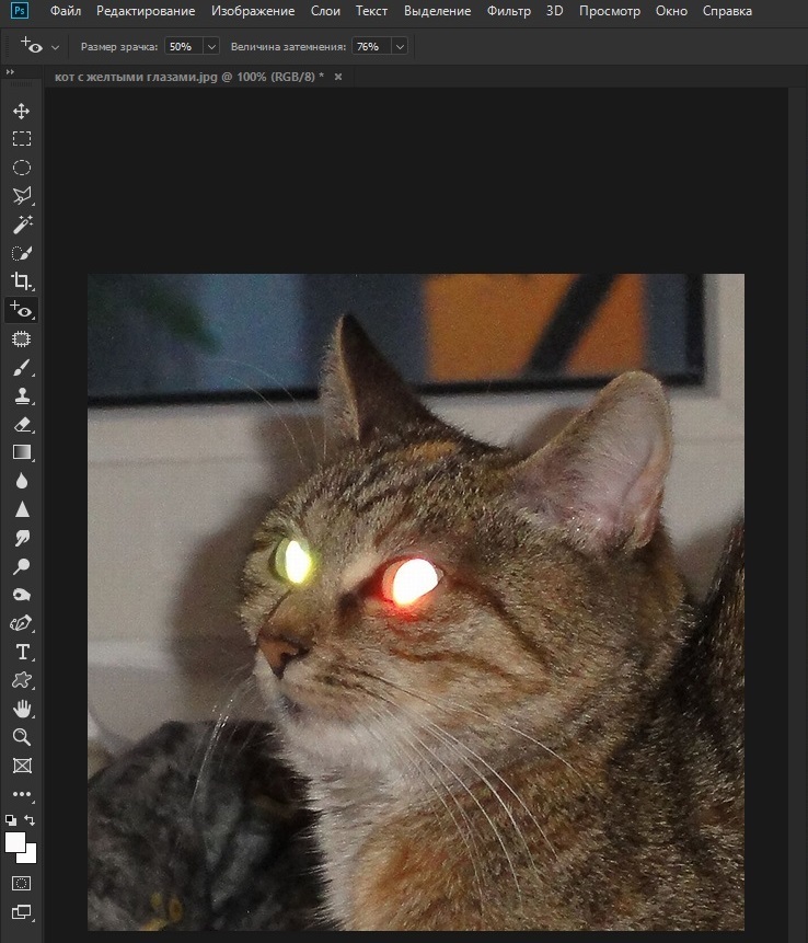 Третий способ используется для самых сложных случаев. На фото вы видите кота со светящимися глазами.