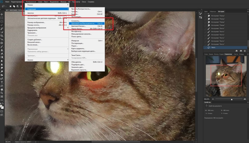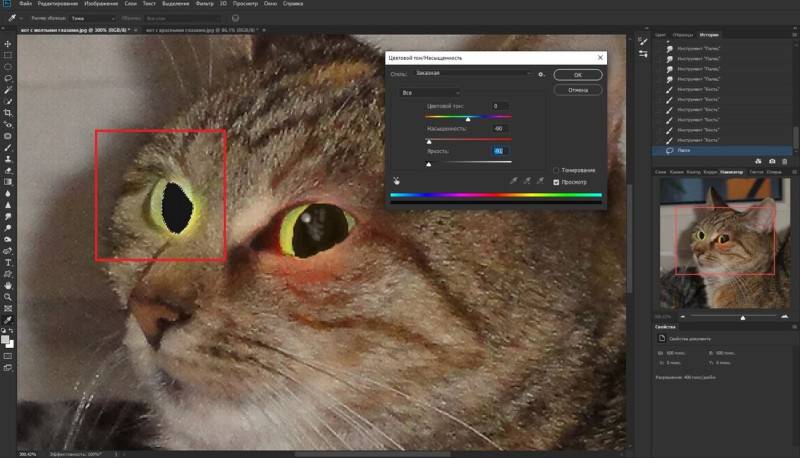 Обычно этих действий вполне достаточно. В случае с нашим котиком придется потрудиться ещё, потому что вокруг глаза остался светлый ареол, и это выглядит странно. На помощь снова придёт Цветовой тон/Насыщенность.