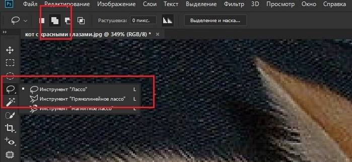 Выберите на левой панели инструмент Лассо и аккуратно выделите оба глаза. Чтобы два выделения сохранялись на фото одновременно, установите опцию + на верхней панели.