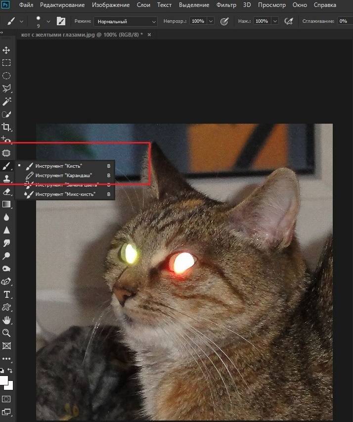 Если на глаза падает тень, то зрачок окажется окрашен неравномерно. Инструмент «Красные глаза» не сможет этого передать. В таком случае лучше использовать Кисть. Найти этот инструмент на панели не сложно.