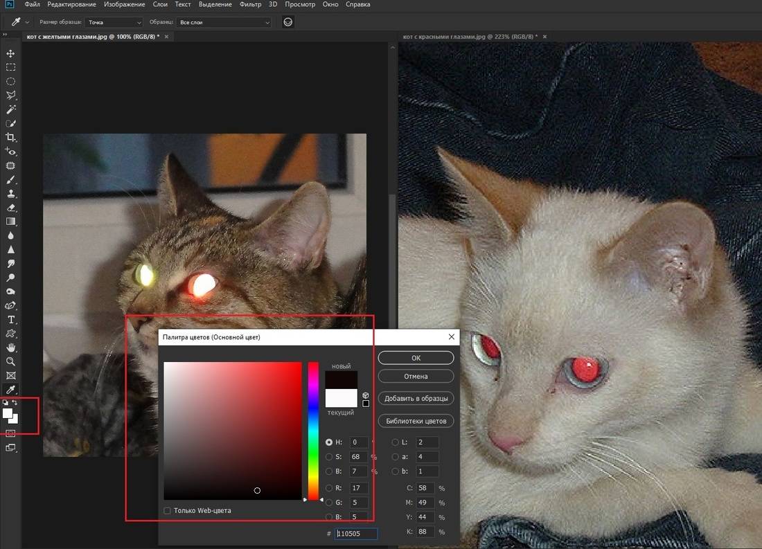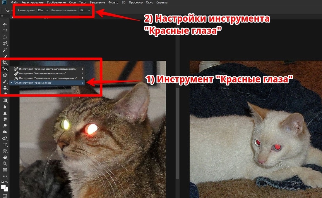 Это самый простой способ решить проблему с игрой цвета. Инструмент находится на левой панели, как правило, рядом с «Восстанавливающей кистью». У него есть две настройки: Размер зрачка и Величина затемнения. Они регулируются бегунками на верхней панели.