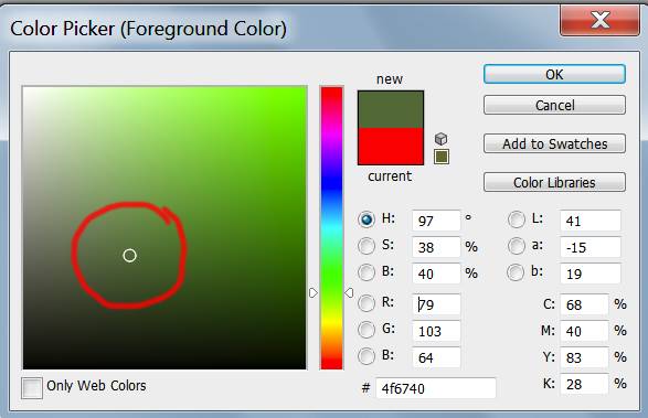 Теперь надо выбрать тот цвет, в который мы будем перекрашивать наши глаза. Чаще всего требуется не изменять цвет радикально, а лишь слегка скорректировать или усилить оттенок (например, сделать серые глаза голубыми). В этих случаях можно выбрать пипетку (Eyedropper Tool (I)) и взять исходный цвет глаза в качестве отправного. Затем в окне Color Picker меняем цвет на более насыщенный: