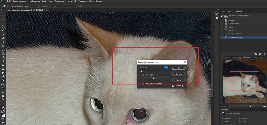 Обычно этих действий вполне достаточно. В случае с нашим котиком придется потрудиться ещё, потому что вокруг глаза остался светлый ареол, и это выглядит странно. На помощь снова придёт Цветовой тон/Насыщенность.