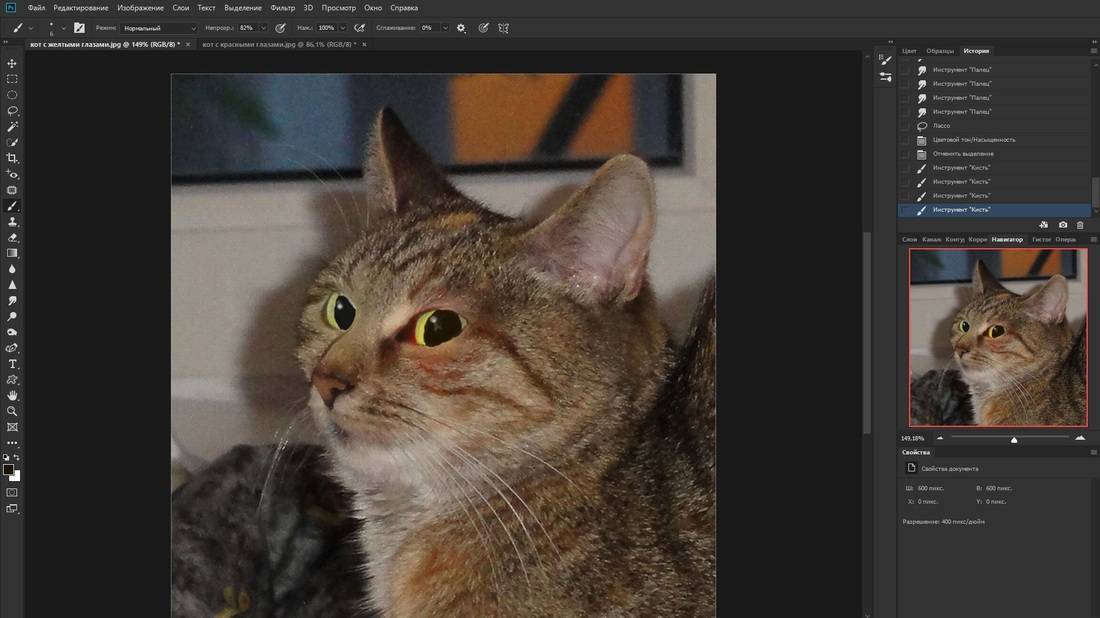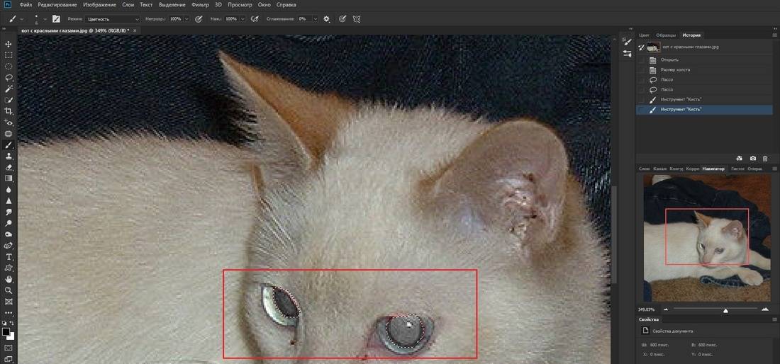 Ситуация усугубляется тем, что блики на фотографии распространились далеко за пределы зрачков и вообще глаз, окрасив даже шерсть вокруг. Здесь придётся проявить смекалку и использовать больше инструментов.