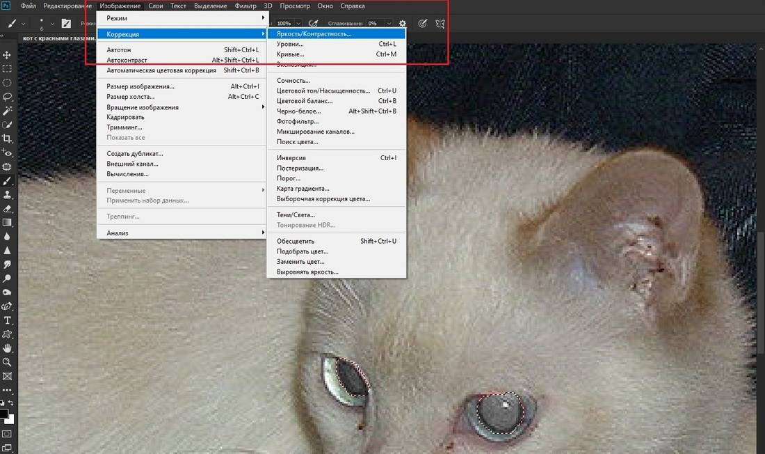 Очень важно выделить красные глаза аккуратно, так, чтобы ни одного красного пикселя не осталось за границей выделения. Для этого максимально увеличьте изображение
