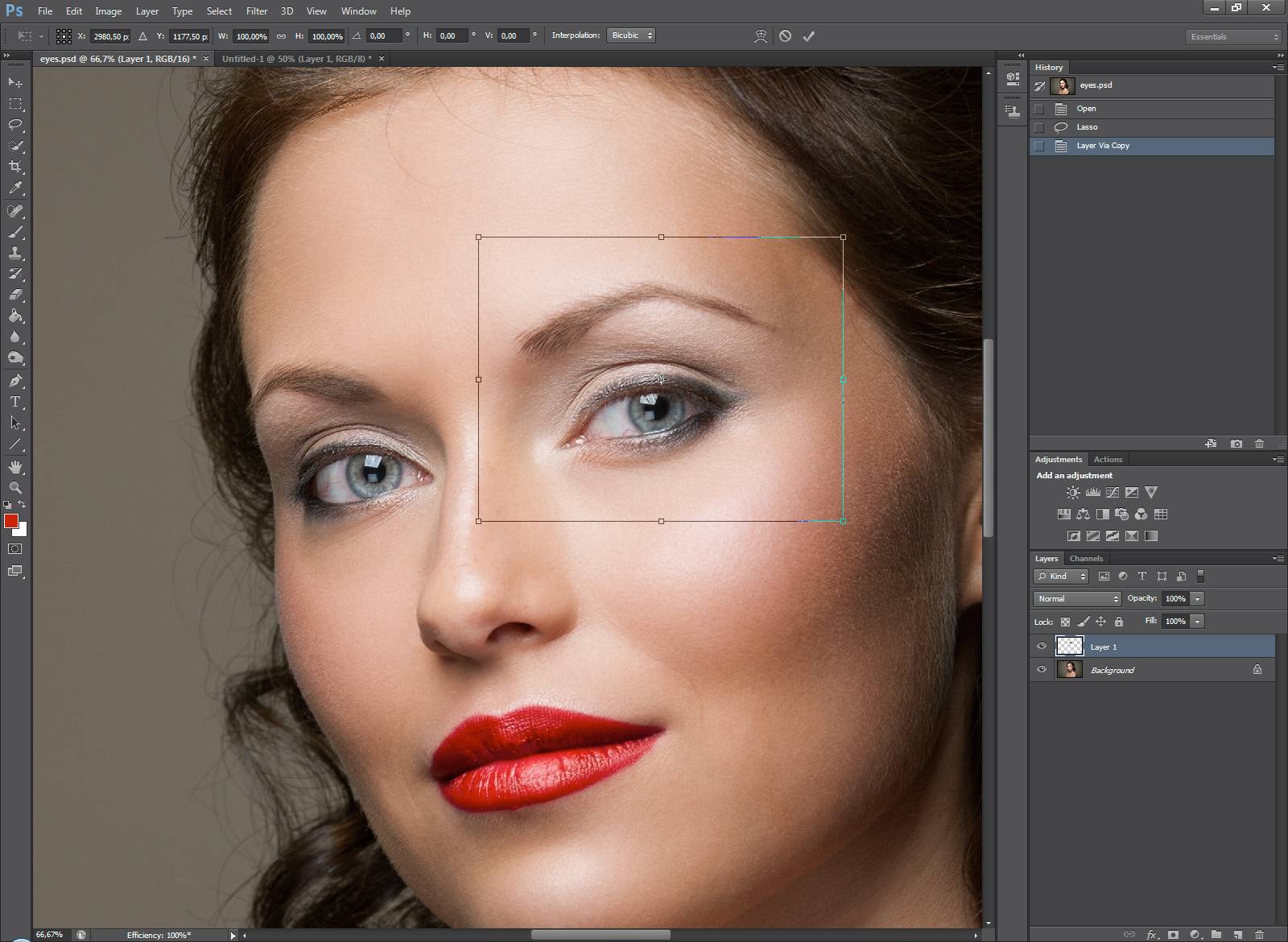 Изменить размер глаз модели можно с помощью инструмента Free Transform. Естественно, следует помнить, что такое вмешательство существенно изменит внешность, а это может понравиться не всем. Однако, если вам нравятся большие глаза, приступим.
