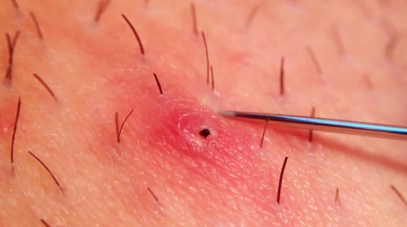 При осмотре бугорок красный, кожа вокруг него отечна, внутри можно увидеть гной и вросший волос, зачастую скрученный «кольцом».