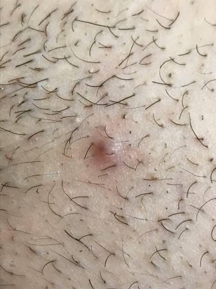 При осмотре бугорок красный, кожа вокруг него отечна, внутри можно увидеть гной и вросший волос, зачастую скрученный «кольцом».