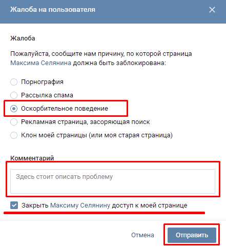 Затем, нам нужно выбрать причину, по которой вы блокируете данного человека. К примеру – Оскорбительное поведение. Ставим чикбокс над данной командой. Затем ниже, в форме комментариев, вы должны написать убедительную причину, по которой администраторы ВК должны заблокировать этого человека.