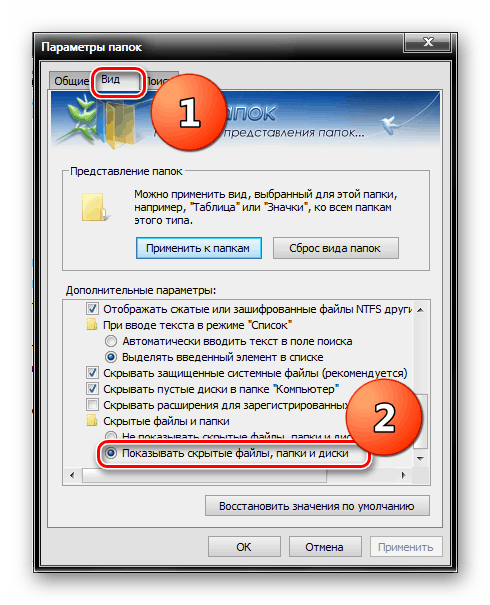 - В следующем окне выбираем вкладку «Вид» и ищем пункт «Показывать скрытые файлы, папки и диски». Необходимо его отметить.