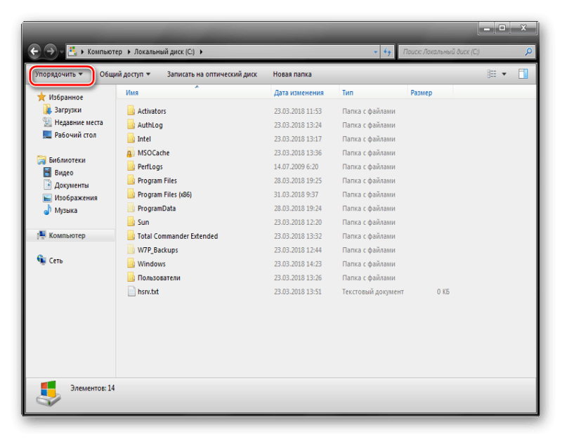 - Открываем «Проводник» и щелкаем по пункту «Упорядочить».