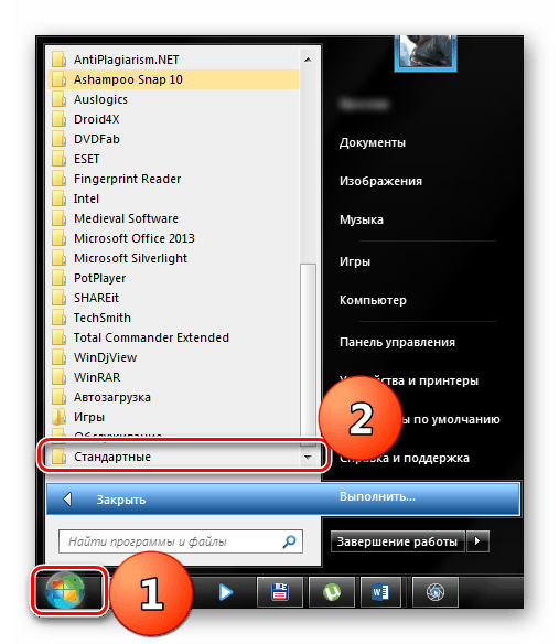 - Откройте меню «Пуск» и найти пункт «Стандартные».