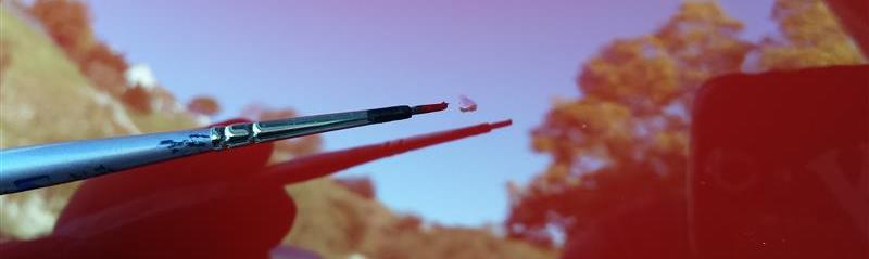 - Для больших сколов используйте шлифовальную бумагу P600 или P800, чтобы сгладить его края и вычистить полость (для удобства используйте ластик на карандаше с приклеенной шлифовальной бумагой). Скошенные края скола позволят более плавно и надёжно растечься краске. Получится плавный переход от старой краски к новой и граница скола будет менее заметной после высыхания краски. Можно немного «захватить» область вокруг скола. Если внутри остался грунт, нужно постараться не счистить его.