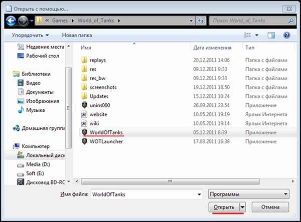 Затем найдите файл WorldOfTanks.exe в папке с установленным клиентом игры (по умолчанию – С:\Games\World_of_Tanks\) и нажмите кнопку Открыть.